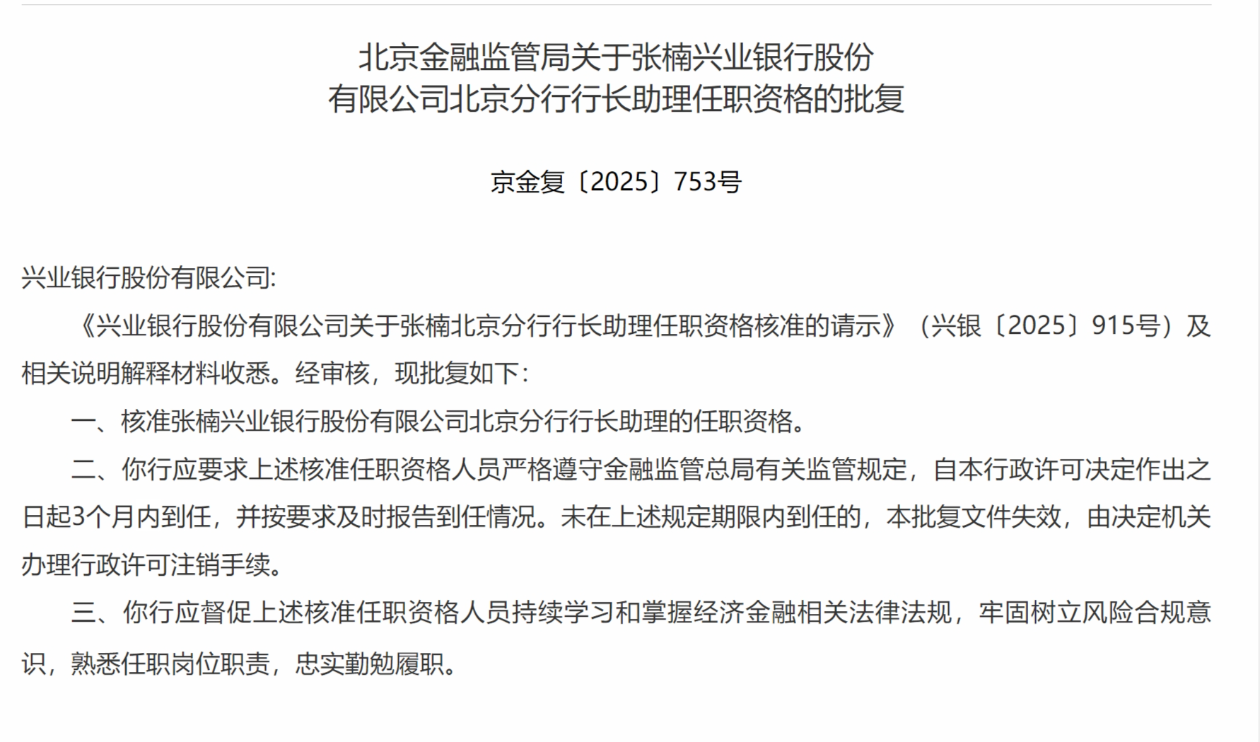 11月28日,北京金融监管局发布关于张楠兴业银行股份有限公司北京分行行长助理任职资格的批复,核准张楠兴业银行股份有限公司北京分行行长助理的任职资格。